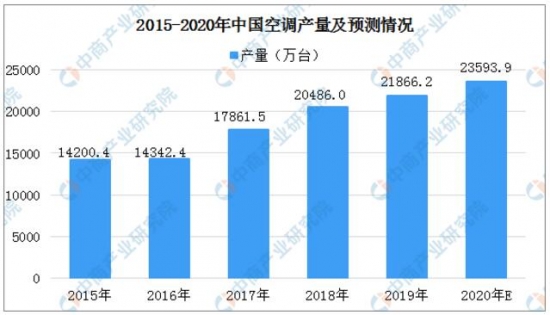據(jù)國(guó)家統(tǒng)計(jì)局?jǐn)?shù)據(jù)顯示:2019年我國(guó)空調(diào)總產(chǎn)量為21866.2萬(wàn)臺(tái),相比2018年提升6.74%。據(jù)中商產(chǎn)業(yè)研究院預(yù)測(cè),2020年我國(guó)空調(diào)總產(chǎn)量將達(dá)23593.9萬(wàn)臺(tái)。